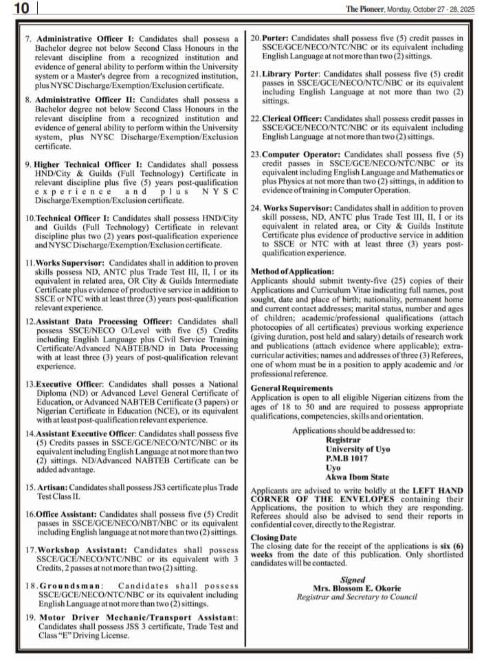 UNIUYO Recruitment 2025 also features several non-academic roles for administrative, laboratory, and technical positions.